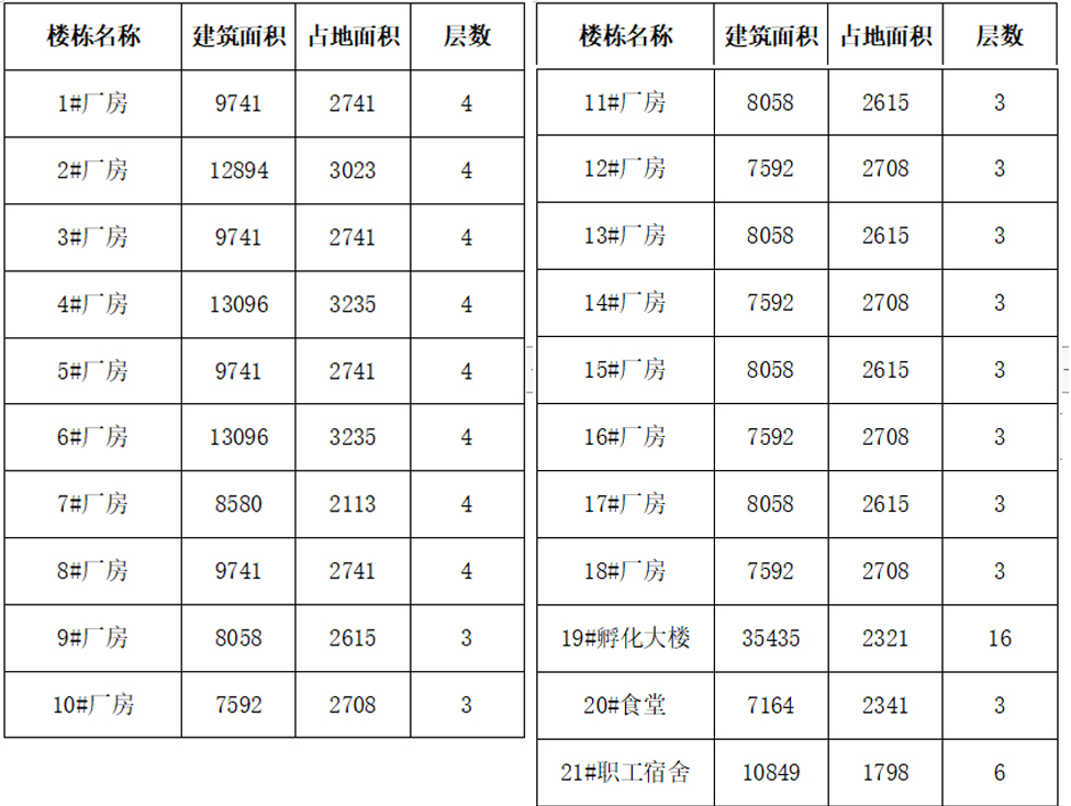 1#、2#、3#、4#、5#、6#、7#、8#廠房為4層丙類廠房:長87.3m、寬37m,每層面積約3000㎡;首層層高6.0米,二至四層層高為5.1米;9#、10#、17#、18#廠房為3層丁類廠房,長73m、寬36m,每層面積約2600㎡,首層層高9.0米,二層層高7.8米,三層層高6.6米;11#、12#、13#、14#、15#、16#廠房為3層丁類廠房,長73m,寬36m,每層面積約2600㎡,首層層高9.0米,二、三層層高6.6米;19#為16層框架剪力墻結構孵化大樓,建筑面積35435平方米;20#為3層框架結構食堂,建筑面積7164平方米,;21#、22#為兩棟6層框架結構宿舍,建筑面積21698平方米;25#、26#為門衛(wèi)室2棟,建筑面積共計144平方米;27#為消防水池和泵房,建筑面積336.3平方米