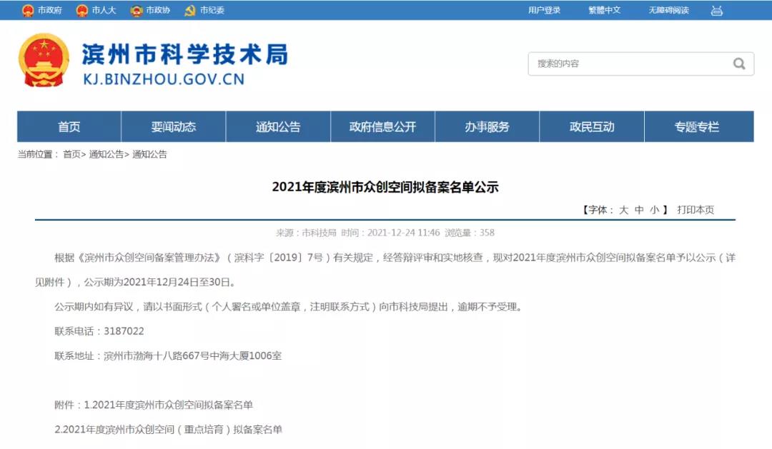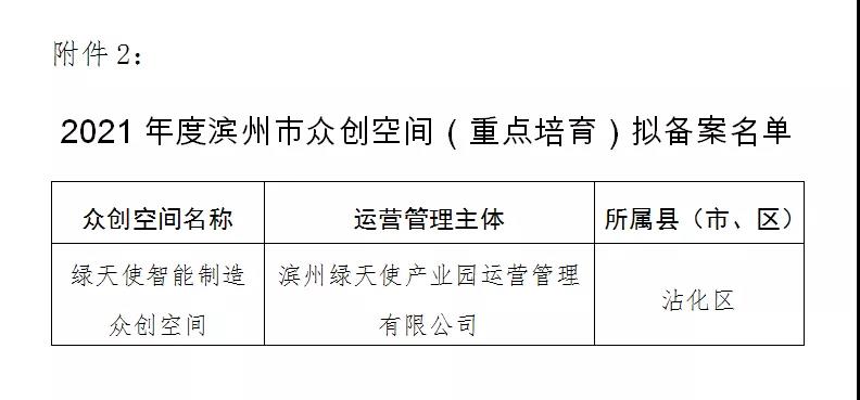 近日,濱州市科學技術局發布《2021年度濱州市眾創空間擬備案名單公示》的通知。綠天使智能制造眾創空間入列2021年度濱州市眾創空間(重點培育)擬備案名單。