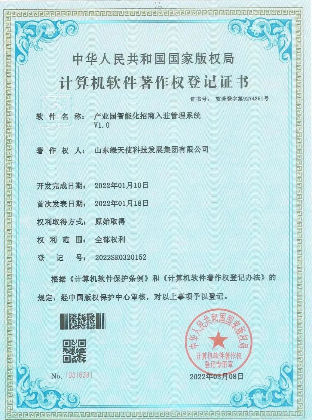 近日,綠天使自主設計與研發——“產業園智能化招商入駐管理系統V1.0”正式上線并獲得國家版權局計算機軟件著作權登記證書。