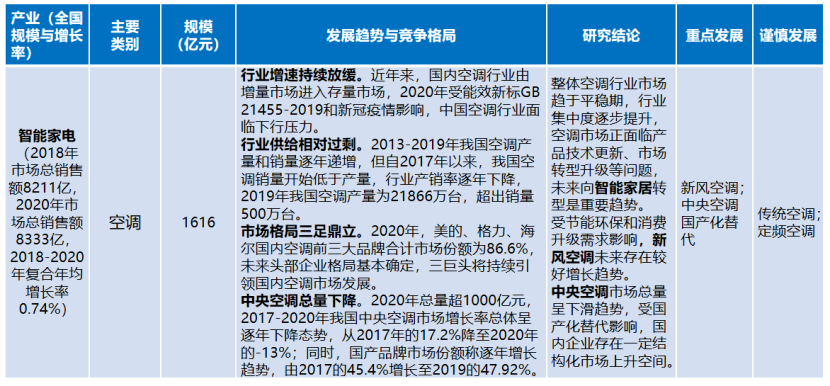 空調(diào)行業(yè)。整體市場(chǎng)趨于平穩(wěn)期,行業(yè)集中度逐步提升,空調(diào)市場(chǎng)正面臨產(chǎn)品技術(shù)更新、市場(chǎng)轉(zhuǎn)型升級(jí)等問(wèn)題,未來(lái)向智能家居轉(zhuǎn)型是重要趨勢(shì)。新風(fēng)空調(diào)和中央空調(diào)國(guó)產(chǎn)化替代存在增長(zhǎng)空間。