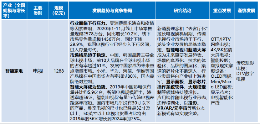 電視行業(yè)。傳統(tǒng)電視行業(yè)市場(chǎng)趨于下行,龍頭企業(yè)發(fā)展格局基本穩(wěn)定,智能電視和超清大屏成為未來(lái)重要發(fā)展趨勢(shì)。場(chǎng)景的套系化、技術(shù)的體驗(yàn)化、品牌的圈層化、渠道的碎片化不斷深入,行業(yè)發(fā)展將向產(chǎn)業(yè)鏈上游進(jìn)軍,顯示面板、顯示芯片、操作系統(tǒng)軟件、大規(guī)模定制等領(lǐng)域?qū)⒊掷m(xù)增長(zhǎng)。應(yīng)用端伴隨電視行業(yè)形態(tài),邊界模糊化,投影、VR/AR/元宇宙等新業(yè)態(tài)新模式有望實(shí)現(xiàn)突破。