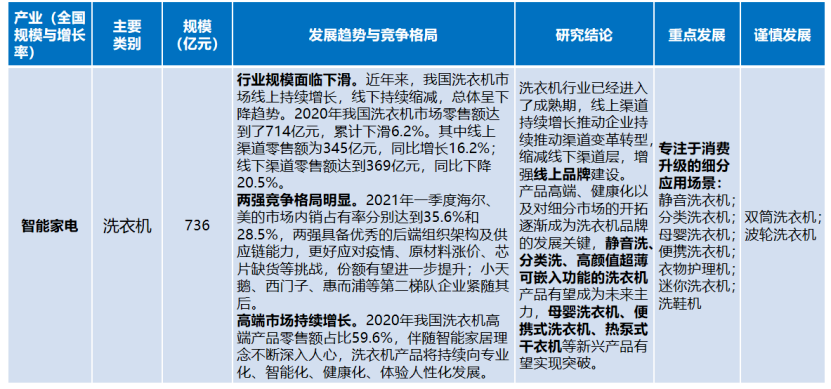 洗衣機(jī)行業(yè)。整體已經(jīng)進(jìn)入成熟期,線上渠道持續(xù)增長(zhǎng)推動(dòng)企業(yè)持續(xù)推動(dòng)渠道變革轉(zhuǎn)型,縮減線下渠道層,增強(qiáng)線上品牌建設(shè)。產(chǎn)品高端、健康化以及對(duì)細(xì)分市場(chǎng)的開拓逐漸成為洗衣機(jī)品牌的發(fā)展關(guān)鍵,靜音洗、分類洗、高顏值超薄可嵌入功能的洗衣機(jī)產(chǎn)品有望成為未來(lái)主力,母嬰洗衣機(jī)、便攜式洗衣機(jī)、熱泵式干衣機(jī)等新興產(chǎn)品有望實(shí)現(xiàn)突破。