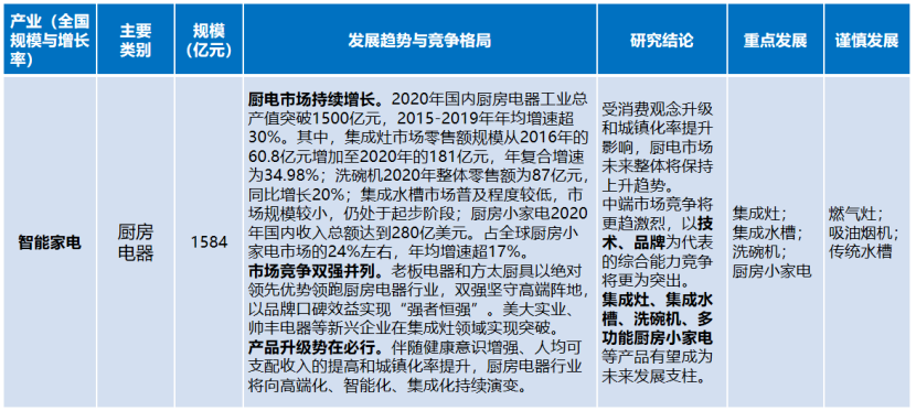 廚房電器行業(yè)。受消費(fèi)觀念升級(jí)和城鎮(zhèn)化率提升影響,廚電市場(chǎng)未來(lái)整體將保持上升趨勢(shì)。中端市場(chǎng)競(jìng)爭(zhēng)將更趨激烈,以技術(shù)、品牌為代表的綜合能力競(jìng)爭(zhēng)將更為突出。集成灶、集成水槽、洗碗機(jī)、多功能廚房小家電等產(chǎn)品有望成為未來(lái)發(fā)展支柱。