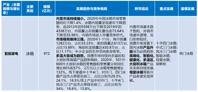 冰箱行業(yè)。內(nèi)需市場(chǎng)基本趨于飽和,外銷市場(chǎng)逐年遞增,出口形勢(shì)較好。消費(fèi)升級(jí)背景下,國(guó)內(nèi)冰箱產(chǎn)品升級(jí)成為必然趨勢(shì),高端化、智能化、健康化、多溫區(qū)、大容積冰箱產(chǎn)品未來(lái)將持續(xù)發(fā)展,母嬰冰箱等新興產(chǎn)品有望實(shí)現(xiàn)突破。