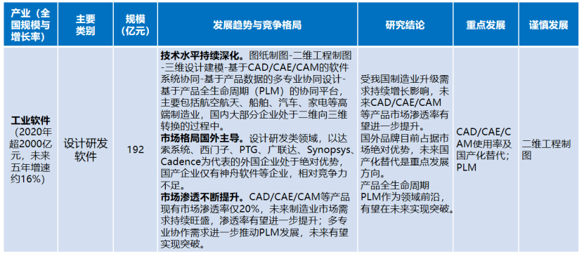 設(shè)計(jì)研發(fā)軟件。受我國(guó)制造業(yè)升級(jí)需求持續(xù)增長(zhǎng)影響,未來(lái)CAD/CAE/CAM等產(chǎn)品市場(chǎng)滲透率有望進(jìn)一步提升。國(guó)外品牌目前占據(jù)市場(chǎng)絕對(duì)優(yōu)勢(shì),未來(lái)國(guó)產(chǎn)化替代是重點(diǎn)發(fā)展方向。產(chǎn)品全生命周期PLM作為領(lǐng)域前沿,有望在未來(lái)實(shí)現(xiàn)突破。