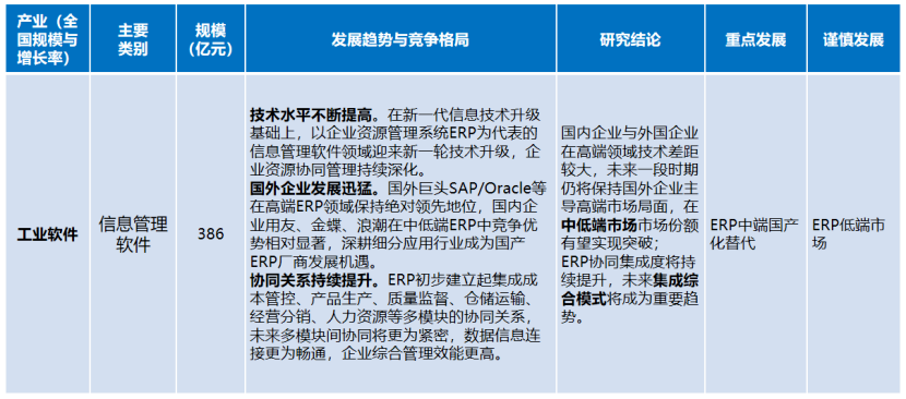 信息管理軟件。國(guó)內(nèi)企業(yè)與外國(guó)企業(yè)在高端領(lǐng)域技術(shù)差距較大,未來(lái)一段時(shí)期仍將保持國(guó)外企業(yè)主導(dǎo)高端市場(chǎng)局面,在中低端市場(chǎng)市場(chǎng)份額有望實(shí)現(xiàn)突破;ERP協(xié)同集成度將持續(xù)提升,未來(lái)集成綜合模式將成為重要趨勢(shì)。