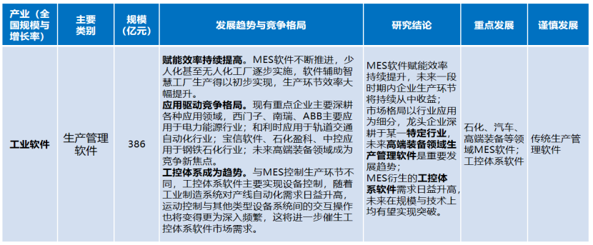 生產(chǎn)管理軟件。MES軟件賦能效率持續(xù)提升,未來(lái)一段時(shí)期內(nèi)企業(yè)生產(chǎn)環(huán)節(jié)將持續(xù)從中收益;市場(chǎng)格局以行業(yè)應(yīng)用為細(xì)分,龍頭企業(yè)深耕于某一特定行業(yè),未來(lái)高端裝備領(lǐng)域生產(chǎn)管理軟件是重要發(fā)展趨勢(shì);MES衍生的工控體系軟件需求日益升高,未來(lái)在規(guī)模與技術(shù)上均有望實(shí)現(xiàn)突破。