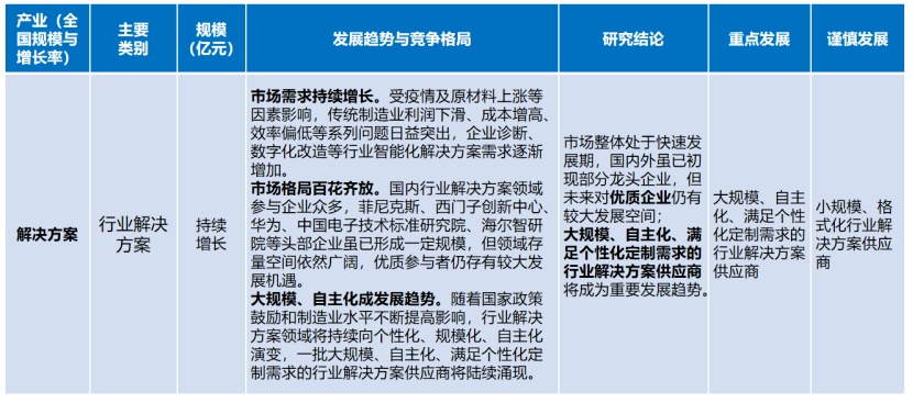 行業(yè)解決方案。市場(chǎng)整體處于快速發(fā)展期,國(guó)內(nèi)外雖已初現(xiàn)部分龍頭企業(yè),但未來(lái)對(duì)優(yōu)質(zhì)企業(yè)仍有較大發(fā)展空間;大規(guī)模、自主化、滿足個(gè)性化定制需求的行業(yè)解決方案供應(yīng)商將成為重要發(fā)展趨勢(shì)。