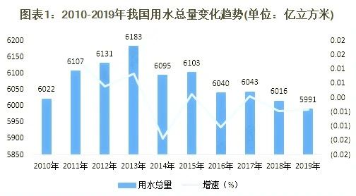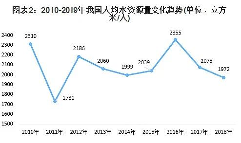 我國水資源長期面臨水資源分布不均、人均占有量少、水資源利用率低的問題。數據顯示,2010-2019年,我國用水量大約維持在6000億立方米左右,近兩年的用水總量雖然負增長,但總量依然較大。同時,2010-2018年,我國人均水資源量呈波動下降趨勢,2018年,人均用水量下降至1972立方米/人。