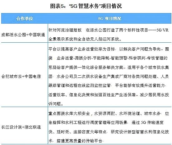 此外,各地水務集團在加快“5G+智慧水務”項目的落地和進程。例如,2019年7月,四川首個5G“智慧水務”項目亮相,項目中的5G VR全景展示系統和全自動無人船巡河系統引人矚目。