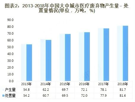隨著城市化進程加快,我國大中城市醫療廢棄物產生量與處置量呈逐年上漲態勢。2018年,我國大中城市醫廢產生量達81.7萬噸,同比增長4.61%;處置量達81.6萬噸,同比增長4.75%。