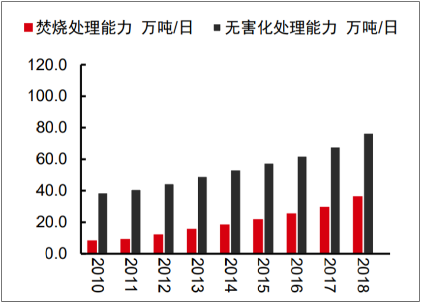 圖表 2010-2018年垃圾焚燒及無害化處理能力變動情況