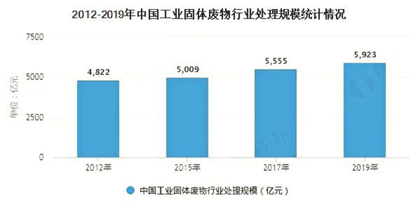 據(jù)相關(guān)資料統(tǒng)計(jì)2015年工業(yè)固體廢物處理市場(chǎng)產(chǎn)值約為5000億,按照675元/噸的處理產(chǎn)值,測(cè)算2019年我國工業(yè)固體廢物的處理規(guī)模約為5923億元。