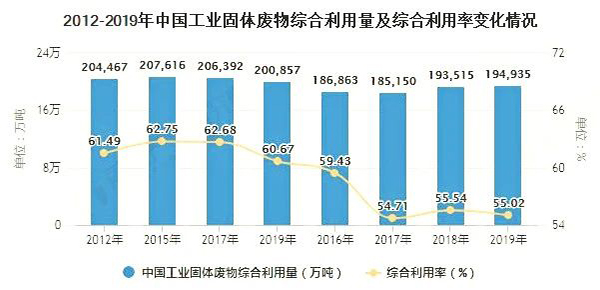 從下圖表數(shù)據(jù)可以看出,2012-2019年,我國工業(yè)固廢綜合利用量波動(dòng)變化,整體表現(xiàn)為2012-2017年工業(yè)固體廢物的綜合利用量波動(dòng)下滑,2018-2019年工業(yè)固體廢物的綜合利用量小幅上升。2019年,全國工業(yè)固廢綜合利用量19.49億噸,同比增長(zhǎng)0.73%,工業(yè)固體廢物的綜合利用率為55.63%。綜合來看,我國工業(yè)固體廢物的綜合利用率還有明顯的提升空間。