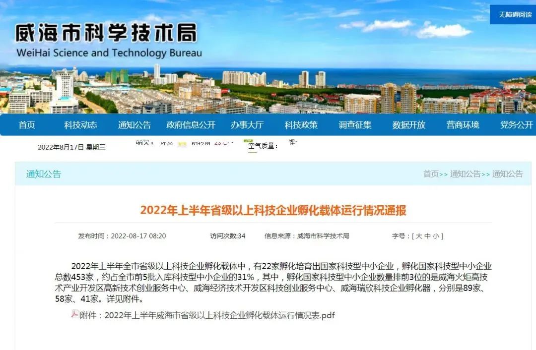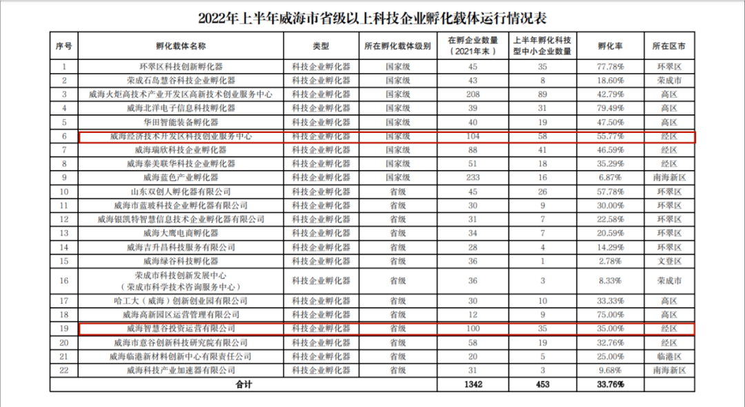 8月17日,威海市科學技術局發布通報,通報了威海市2022年上半年省級以上科技企業孵化載體運行情況。根據通報顯示,威海經濟技術開發區科技創業服務中心(即智慧谷科創孵化產業園)作為國家級孵化器,以上半年孵化科技型中小企業58家,位列全市第2名;智慧谷投資運營有限公司作為省級孵化器,以上半年孵化科技型中小企業35家,位列全市第4名。