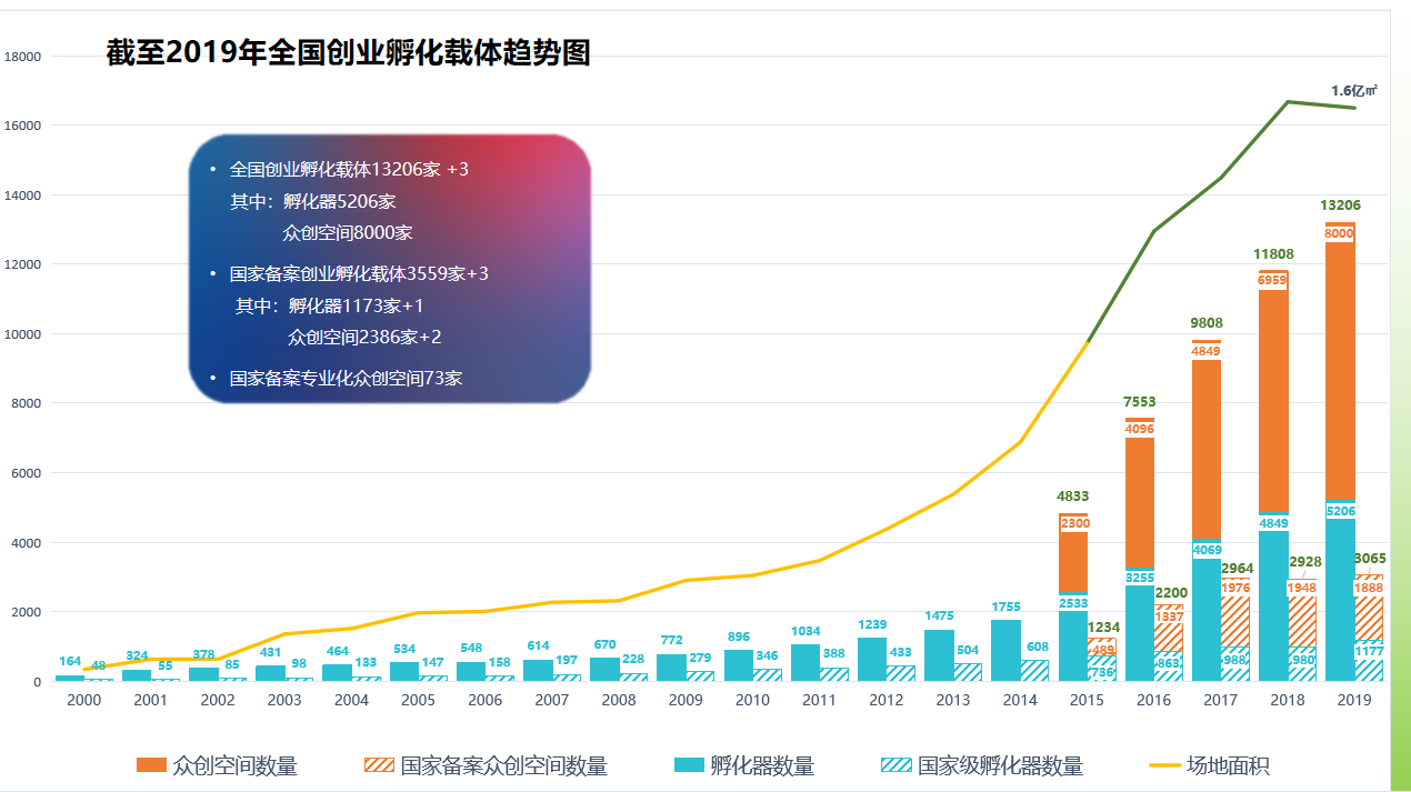 創(chuàng)業(yè)孵化行業(yè)發(fā)展迅猛,一批順應(yīng)時(shí)代創(chuàng)新創(chuàng)業(yè)特點(diǎn)和需求的眾創(chuàng)空間呈現(xiàn)爆發(fā)式發(fā)展態(tài)勢(shì)。孵化載體數(shù)量規(guī)模為全球之首,實(shí)現(xiàn)了全國(guó)布局,形成了“眾創(chuàng)—孵化—加速”創(chuàng)業(yè)孵化鏈條和眾創(chuàng)集聚區(qū)。