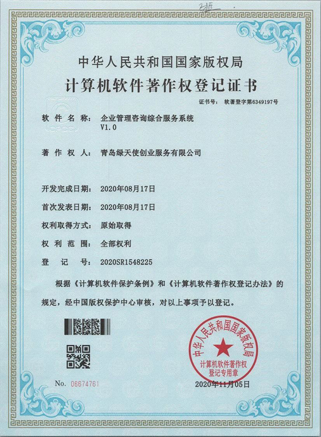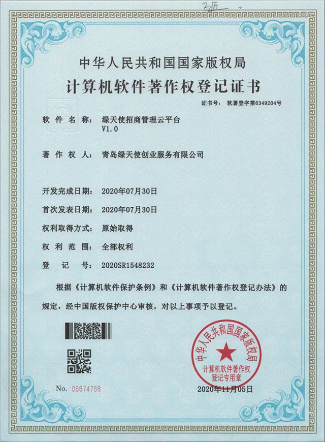 此次軟件著作權的成功申請是綠天使研發團隊及所有員工共同努力的結果,是綠天使積極響應互聯網+,注重科技創新的成果,不僅意味著綠天使的自主研發能力得到了權威的認可,也標志著綠天使在軟件研發、自主創新領域邁上了一個新的臺階。