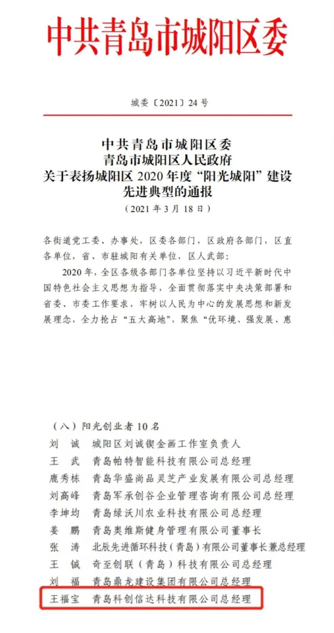 為充分發揮典型的旗幟引領作用,進一步激發全區上下參與“陽光城陽”建設的積極性、創造性,推動“陽光城陽”建設不斷向實踐化、實體化和實效化扎實邁進,近日,園區企業青島科創信達科技有限公司創始人兼總經理王福寶被授予“陽光創業者”榮譽稱號。