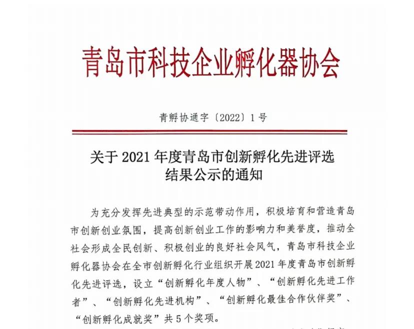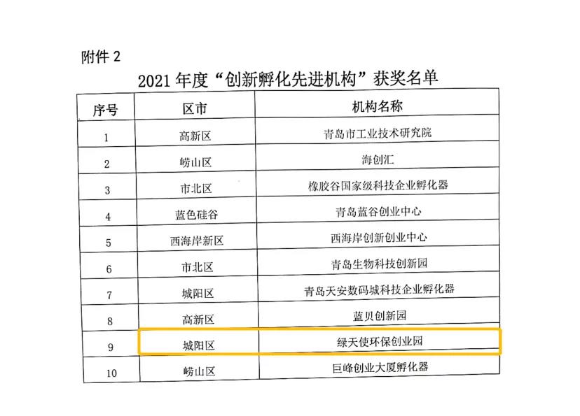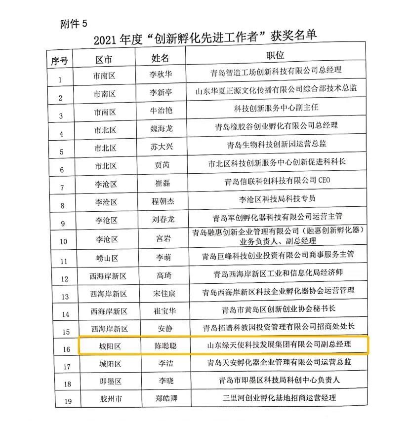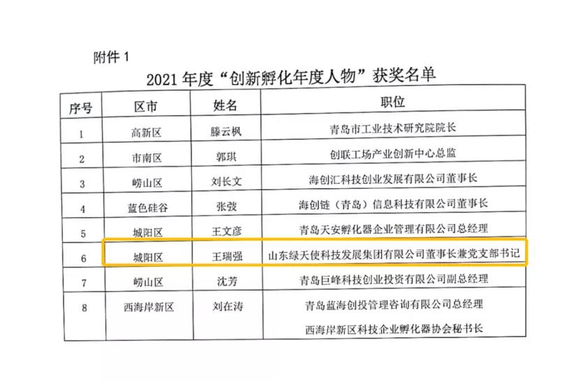 近日,青島市科技企業孵化器協會公示了2021年度青島市創新孵化先進評選結果,綠天使獲多項殊榮,其中:綠天使環保創業園榮獲“創新孵化先進機構”獎,山東綠天使科技發展集團有限公司董事長王瑞強榮獲“創新孵化年度人物”獎,副總經理陳聰聰榮獲“創新孵化先進工作者”獎。