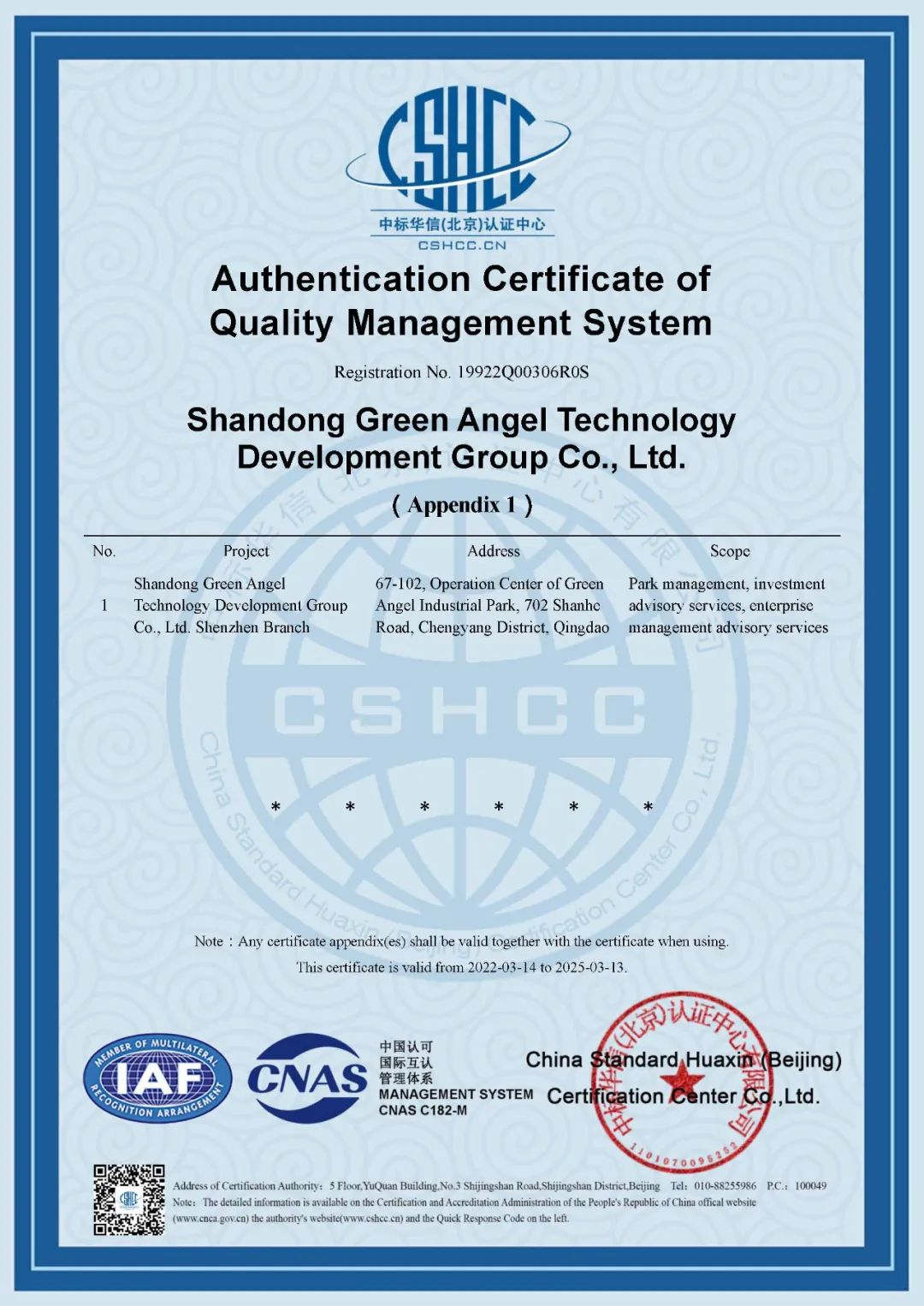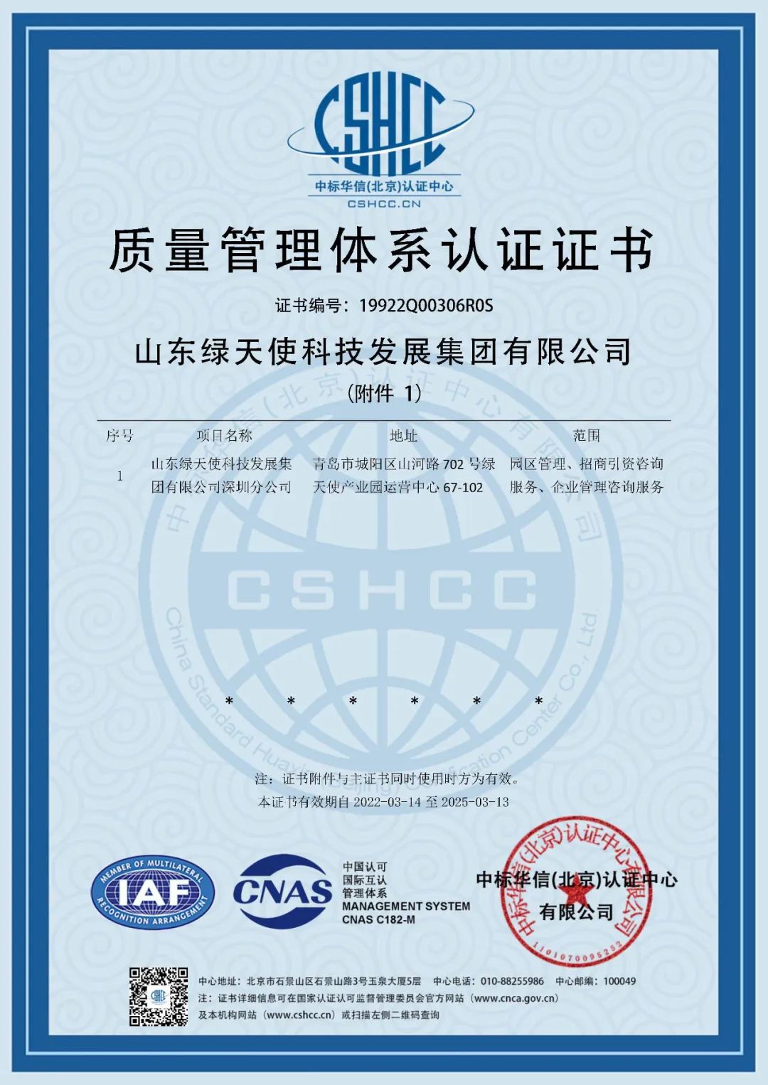 為建立健全的質量管理體系,不斷完善管理機制,進一步提高服務質量,打造園區管理、招商引資服務及企業服務等規范化服務體系。近日,綠天使集團按照ISO9001質量管理體系標準進行了系統化規范化服務體系的提升并順利通過認證,榮獲認證證書。