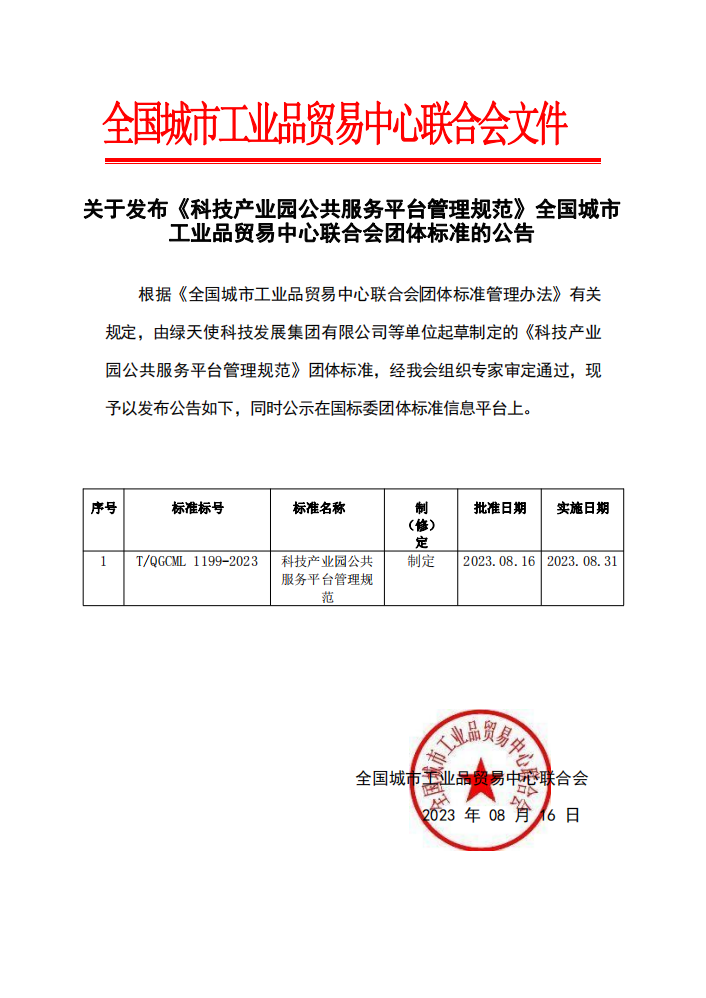 近日,根據(jù)《全國(guó)城市工業(yè)品貿(mào)易中心聯(lián)合會(huì)團(tuán)體標(biāo)準(zhǔn)管理辦法》有關(guān)規(guī)定,由綠天使科技發(fā)展集團(tuán)有限公司主導(dǎo)起草制定的《科技產(chǎn)業(yè)園公共服務(wù)平臺(tái)管理規(guī)范》團(tuán)體標(biāo)準(zhǔn),經(jīng)全國(guó)城市工業(yè)品貿(mào)易中心聯(lián)合會(huì)組織專家審定通過并發(fā)布,同時(shí)公示在國(guó)標(biāo)委團(tuán)體標(biāo)準(zhǔn)信息平臺(tái)上。