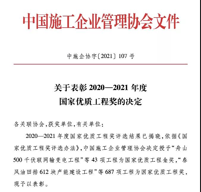 近日,中國施工企業管理協會公布2020-2021年度第二批國家優質工程獎獲獎名單,共評選出24項國家優質工程金獎,351項國家優質工程獎。