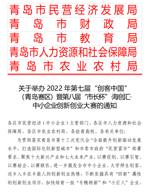 2022年第七屆“創客中國”(青島賽區)暨第八屆“市長杯”·海創匯·中小企業創新創業大賽報名進行中!
